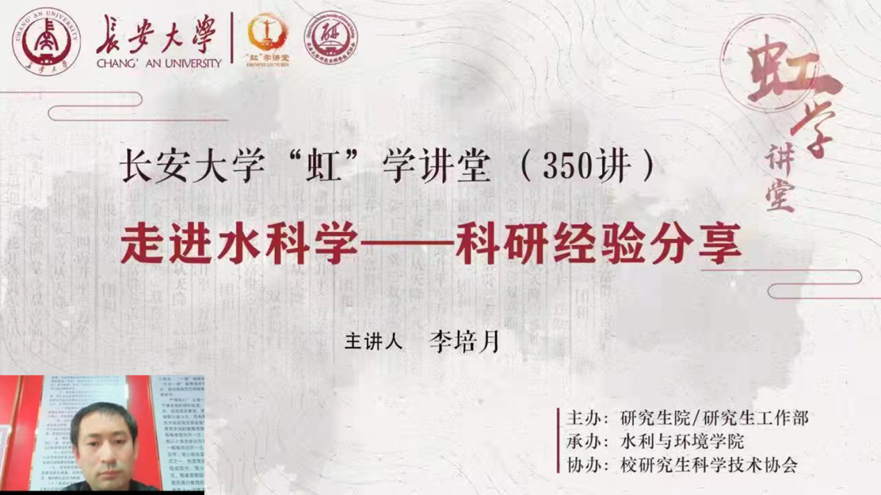 承办,校研究生科学技术协会协办的“虹”学讲堂第350讲以线上讲座形式顺利举办。长安大学东院教学区疫情防控工作组学院李培月教授作了题为“走进水科学——科研经验分享”的报告,相关学院共计400余名师生参加了此次讲座。