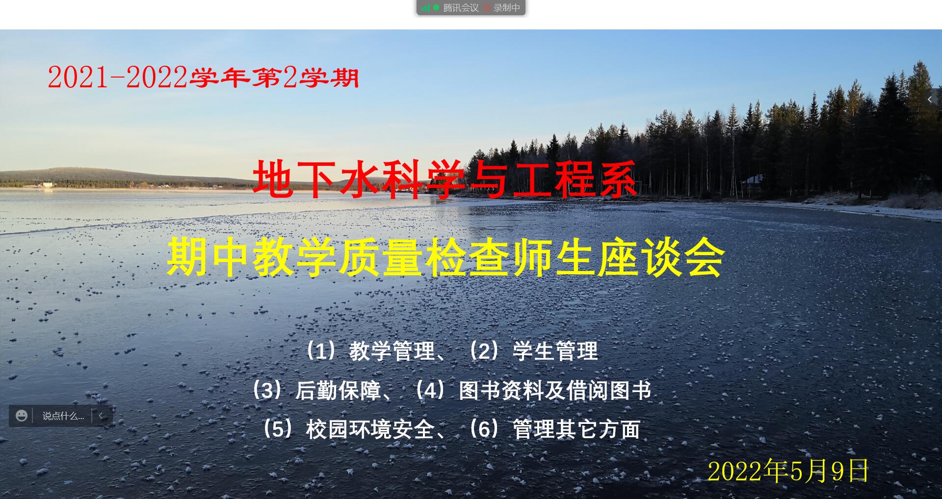 为进一步加强日常教学管理,全面了解在校园疫情防控新形势下广大学生对学校、学院、系室在教育教学、管理服务等方面的意见和建议,及时发现和处理教学各环节存在的问题,根据《长安大学期中教学质量检查实施办法》(长大教〔2012〕296号)文件精神,地下水科学与工程系于5月9日下午,利用腾讯会议召开了2021-2022学年第二学期期中教学质量检查师生座谈会,学院副院长李培月、专业责任教授乔晓英、地下水系主任黄文峰、地下水系教师代表及本科四个年级的学生代表共计30余人参加本次会议。