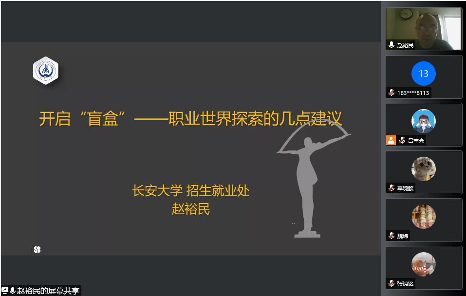 对研究生就业工作紧抓不懈。1月4日,学院邀请长安大学招生就业指导教研室主任赵裕民为研究生做《开启“盲盒”——职业世界探索的几点建议》讲座,为研究生进行线上就业指导,全体毕业班研究生参加,学院党委副书记王妍主持。